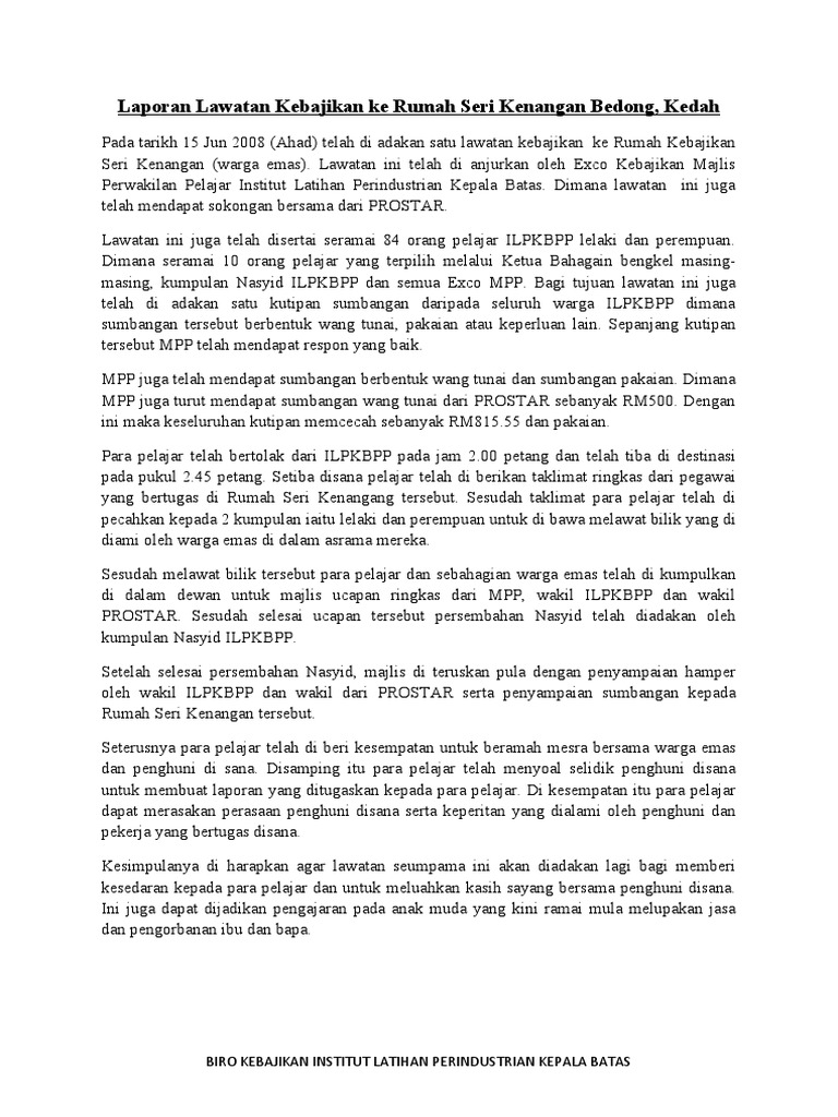 Contoh Karangan Syarahan Spm Blog Ini Bertujuan Memberi Bimbingan Dalam Mata Pelajaran from summer-absolutely.icu Contoh karangan laporan lawatan ke rumah anak yatim via contohsoal2.blogspot.com surat penangguhan via www.scribd.com contoh karangan berbentuk cerita via www.slideshare.net contoh karangan laporan lawatan ke rumah orang tua via contohyes.blogspot.com surat mohon bas via www.scribd.com perumahan alfafa : Doc kertas kerja lawatan ke rumah orang tua nor farahiyah academia edu. Seperti yang diketahui kemahiran sosial dan kebertanggungjawaban adalah amat penting dan perlu diterapkan dalam diri setiap remaja bermula dari usia yang muda. Kertas kerja lawatan ke rumah orang tua. Jika anda mencari contoh karangan laporan lawatan ke rumah anak yatim maka anda berada di tempat yang tepat blog contohenem memiliki banyak koleksi gambar seperti contoh karangan laporan lawatan ke rumah anak yatim gambar ini tersedia dalam format jpg png gif. 1) melawat ladang ternakan lembu 2) rumah baharu sofia 3) hari pertama ke sekolah 4) gotong royong 5) lawatan ke rumah orang orang tua 6) melawat rakan di hospital 7) menolong jiran 8) kebersihan tempat tinggal 9) keracunan makanan 10)hari ibu 11)hari guru 12) majlis hari jadi 13) hari kebangsaan 14. Sana adakan lawatan ke rumah warga tua sri pritchard kinarut utusan borneo online. 1) melawat ladang ternakan lembu 2) rumah baharu sofia 3) hari pertama ke sekolah 4) gotong royong 5) lawatan ke rumah orang orang tua 6) melawat rakan di hospital 7) menolong jiran 8) kebersihan tempat tinggal 9) keracunan makanan 10)hari ibu 11)hari guru 12) majlis hari jadi 13) hari kebangsaan 14.